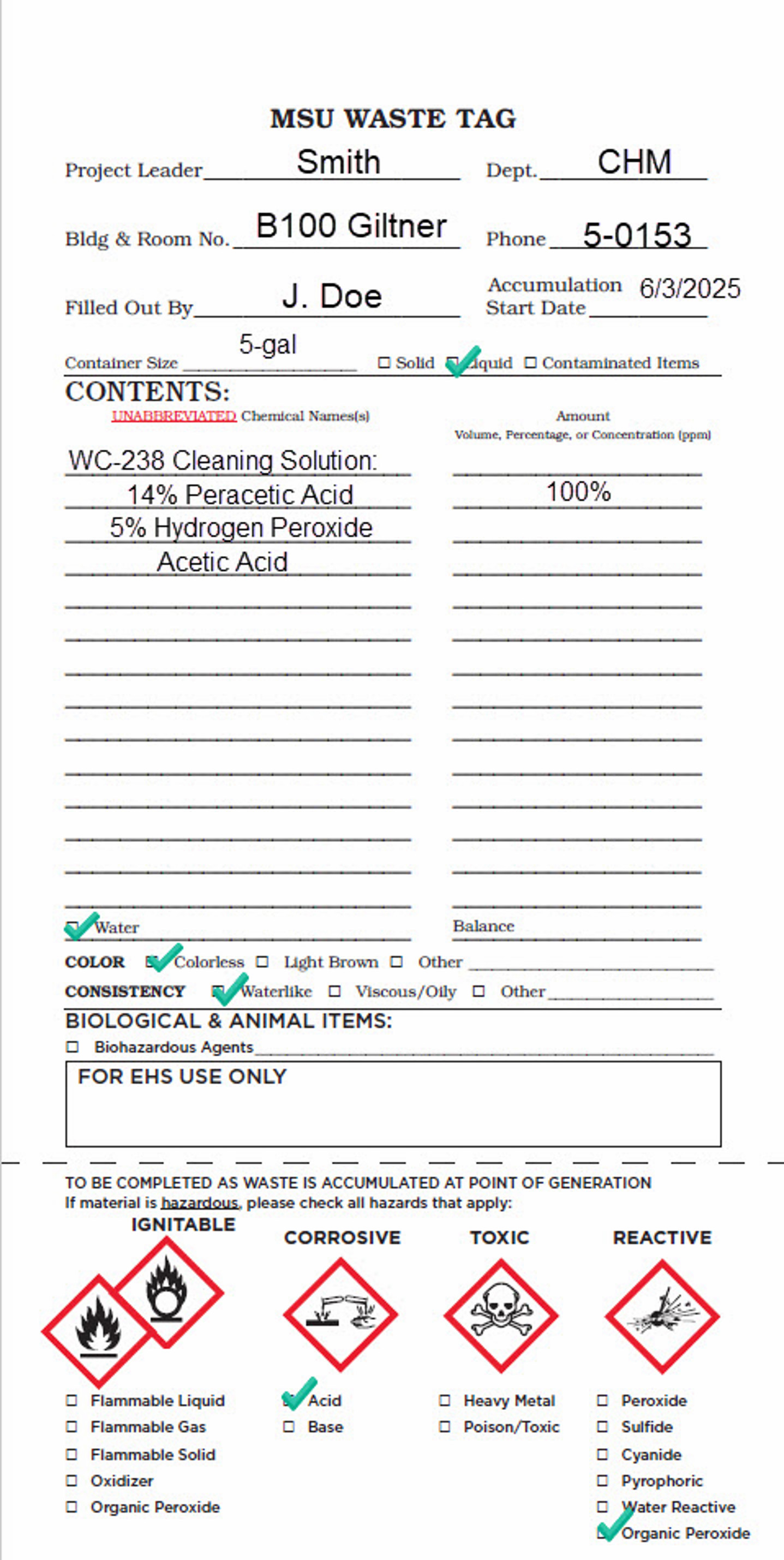 All chemical constituents must be accounted for on the MSU Waste Tag. Chemical names must be printed legibly, in English, and with no abbreviations. The amount of chemical constituents can be captured by either using percentages up to 100%, or by units of volume. Either way, these need to match the amount of waste in the container when EHS arrives to pick up the material. Inaccuracies and discrepancies on the MSU Waste Tag can result in the waste being rejected by the EHS Hazardous Waste Staff for safety and compliance reasons. For aqueous solutions, the check box for “Water Balance” can be used to account for the remaining percentages or volume. Chemical constituents must be identified on the MSU Waste Tag as they are added to the container, as guessing the contents of a full container creates safety and compliance violations.